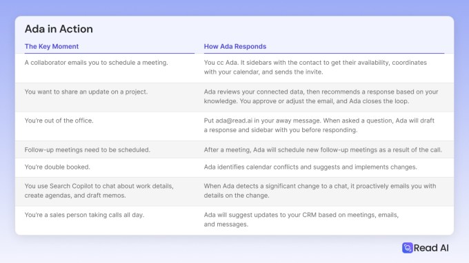 Компания называет Ada “цифровым двойником”, который выполняет задачи за вас круглосуточно. Read AI сообщил, что помощник будет доступен всем пользователям, и они могут начать его настройку, отправив электронное письмо на адрес “ada@read.ai” и написав “Помогите мне начать”.