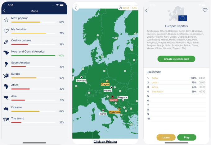 Seterra позволяет вам отслеживать свой прогресс в разных категориях и просматривать таблицы лидеров с указанием лучших бомбардиров в каждой игре.