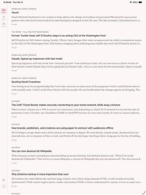 Новое приложение под названием Current переосмысливает RSS-ридер, стремясь предложить читателю ощущение, которое больше похоже на погружение в поток новостей, а не на выполнение задачи. Таким образом, приложение могло бы сделать использование RSS-каналов для получения новостей и информации более доступным для тех, кто не пользуется новостями по работе и не считает себя информационным наркоманом.