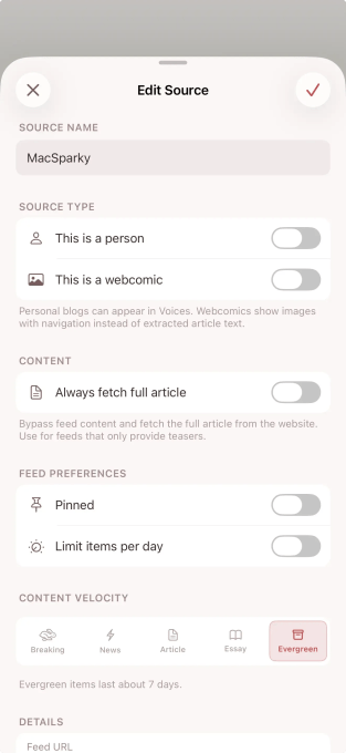 Приложение также повышает удобство чтения: если какой-либо сайт заполоняет вашу ленту, приложение предложит вам отключить его или ограничить количество просмотров. Он также замечает, когда вы регулярно пропускаете определенный контент или с энтузиазмом читаете его, и предложит вам либо удалить каналы, которые вы редко читаете, либо закрепить те, которые вы читаете.