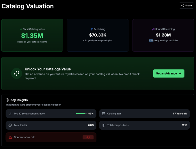 Компания также внедрила инструмент оценки стоимости каталога, который позволяет оценить стоимость каталога исполнителя при записи и публикации. Инструмент разбивает оценки по отдельным трекам и источникам дохода, таким как Spotify и Apple Music. Пончик сказал, что основной тезис заключается в том, чтобы помочь артистам лучше управлять своим каталогом и монетизировать его.