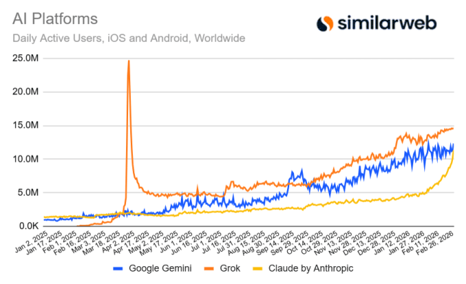 В этой связи другой поставщик маркетинговой информации, Similarweb, обнаружил, что 2 марта приложение Claude на устройствах iOS и Android ежедневно посещали 11,3 миллиона активных пользователей, что на 183% больше, чем в начале года, когда оно использовалось около 4 миллионов раз, и по сравнению с 5 миллионами активных пользователей в день в начале февраля.