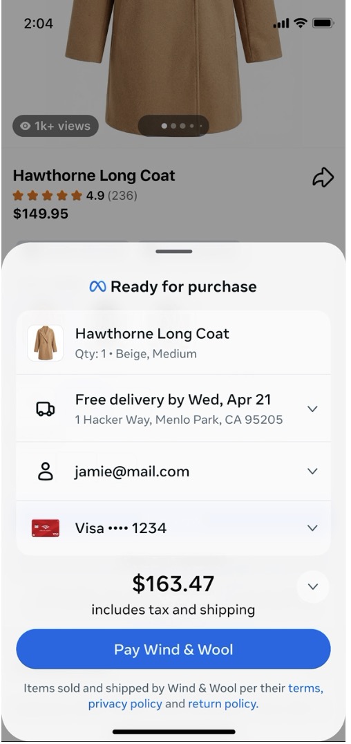 Затем следует обновленный процесс оформления заказа, разработанный в партнерстве с платежными системами Stripe и PayPal, который позволяет потребителям совершать покупку одним касанием. Meta сообщает, что уже работает над другими интеграциями с Ayden и Shopify, которые будут внедрены в будущем.