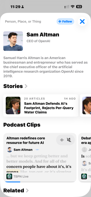 Функция "Подкасты и клипы" в Particle привязана не только к новостным сюжетам. Поскольку приложение уже понимает различные объекты — например, людей, места или предметы, — вы можете перейти на страницу известной фигуры, такой как генеральный директор OpenAI Сэм Альтман, чтобы просмотреть все его выступления в подкастах, организованные в виде ленты.
